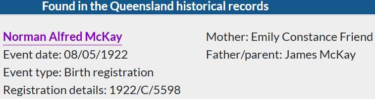 | Norman Alfred McKay | 8 may 1922 Mackay, Queensland |