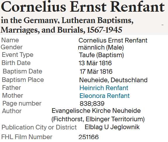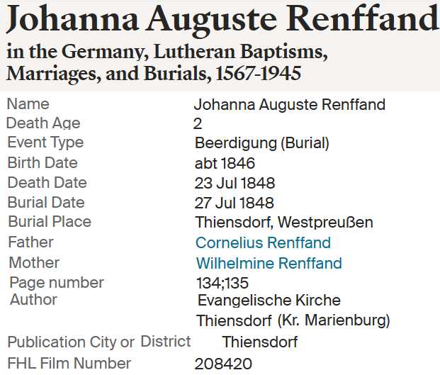 | Maria Elisabeth Renfandt | 16 Mar 1853 Evangelische Kirche Thiensdorf (Kr. Marienburg) |