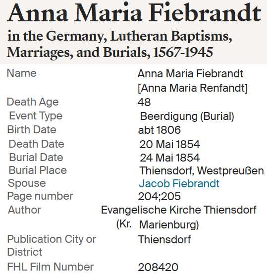 | C5 | Helena Eleanora Renfandt | 9 Mar 1812 | 21 Mar 1853 Evangelische Kirche Thiensdorf (Kr. Marienburg) |