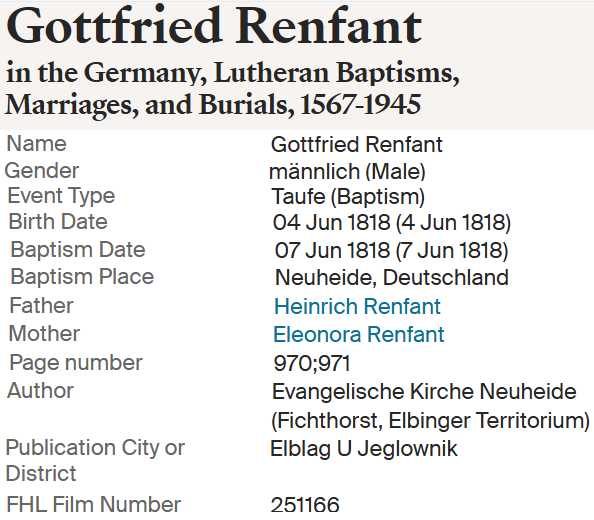 | C8 | Gottfreid Renfandt | 4 Jun 1818 Evangelische Kirche Neuheide (Fichthorst, Elbinger Territorium) |