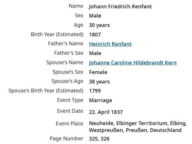 Johann Friedrich Renfandt - Marriage - 1837 From Family Search