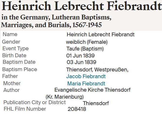 Evangelical (Lutheran) Church , Thiensdorf, Prussia FHC Films 208416 - 208420 Heinrich Lebreiht Fiebrand Baptism 1838 - Anna Maria Renfandt - Mother ![]() ![]() |