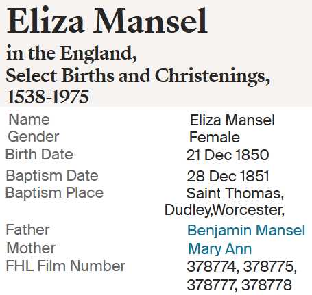 | 2 | Hannah Mansell | 25 Jun 1849 Saint Thomas,Dudley, Worcester,England |