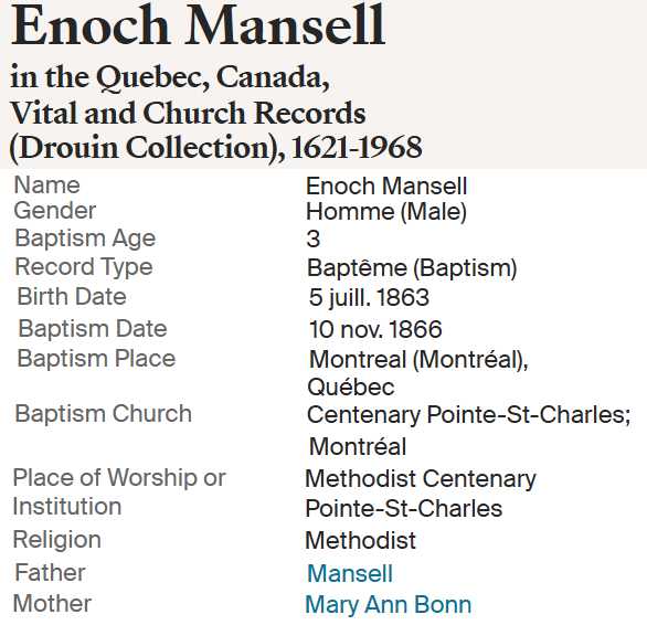 | 7 | Enoch Mansell | 5 Jul 1863 Montreal, Montreal Region, Quebec, Canada |