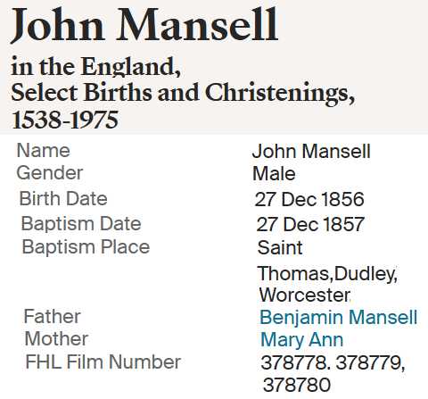 | 4 | John Marion Mansell | 26 Dec 1856 Dudley, Staffordshire, England |