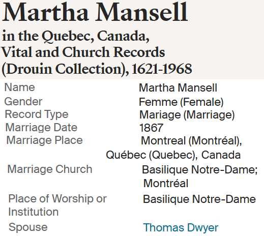 | 8 | Mary Ann Mansell | 5 Apr 1865 Montreal Region, Quebec, Canada |