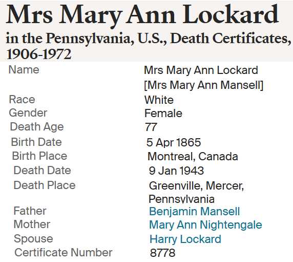 | 11 | Daisy Mansell | 17 Apr 1873 Greenville, Mercer County, Pennsylvania |