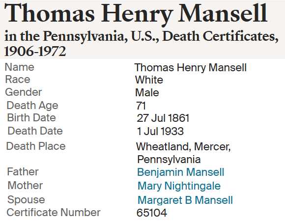 | 10 | Samuel Mansell | 25 Sep 1871 Greenville, Mercer County, Pennsylvania |