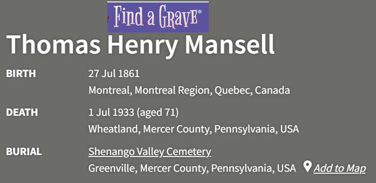 | 6 | Thomas Henry Mansell | 27 Jul 1861 Montreal, Montreal Region, Quebec, Canada |