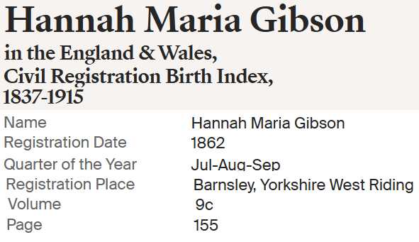 | Hannah Maria Gibson | 06 Sep 1862 Worsborough, Yorkshire, England |