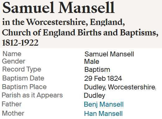 | 3 | Samuel Mansell | 29 FEB 1824 Saint Thomas, Dudley, Worcester, England |