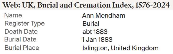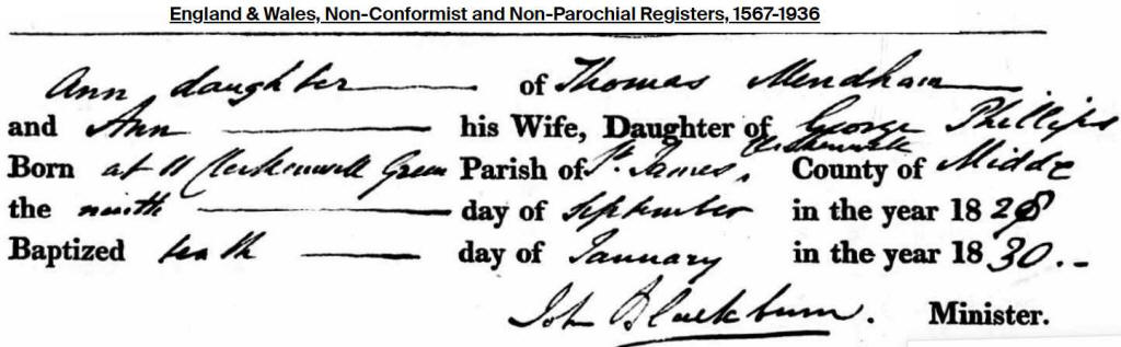 | Ann Mendham | 9 Sep 1829 Bap 10 Jan 1830 |