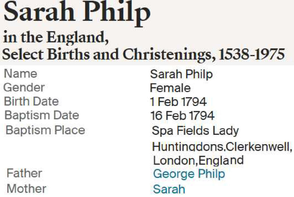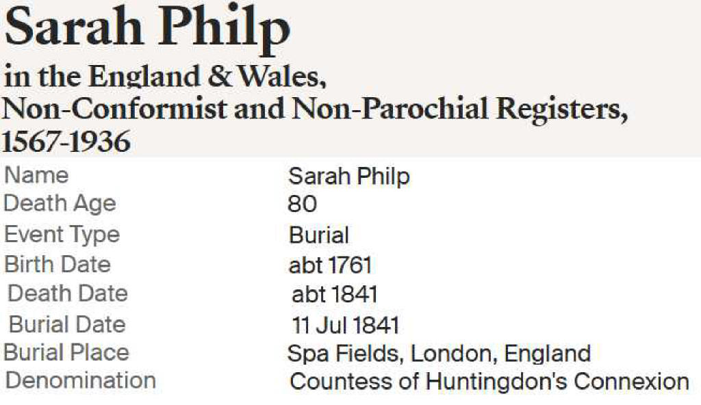 | Sarah Philp | 27 DEC 1791 (Ch) 04 MAR 1792 Spa Fields Lady Huntingdons, Clerkenwell, London, England |