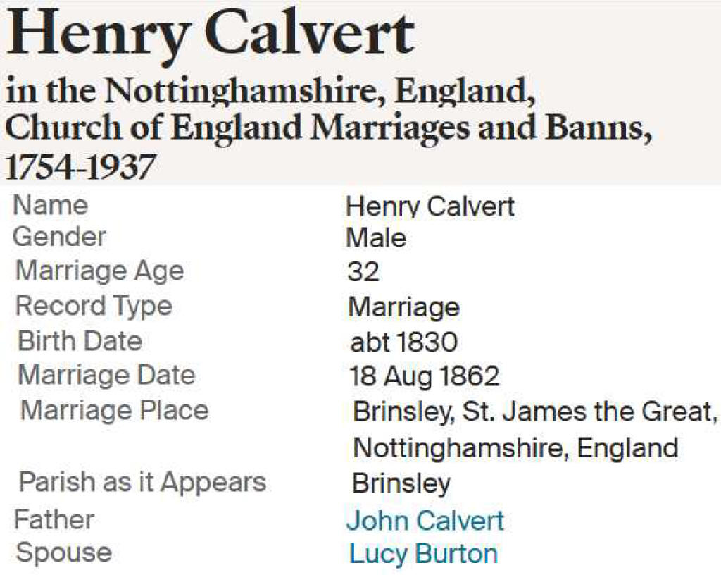 | Henry Calvert | 1830 | 1894 | Lucy Burton 1862 |