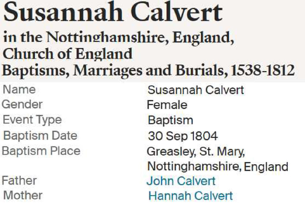 | Susannah Calvert | 1804 | John Clark ?? 1824 | ||