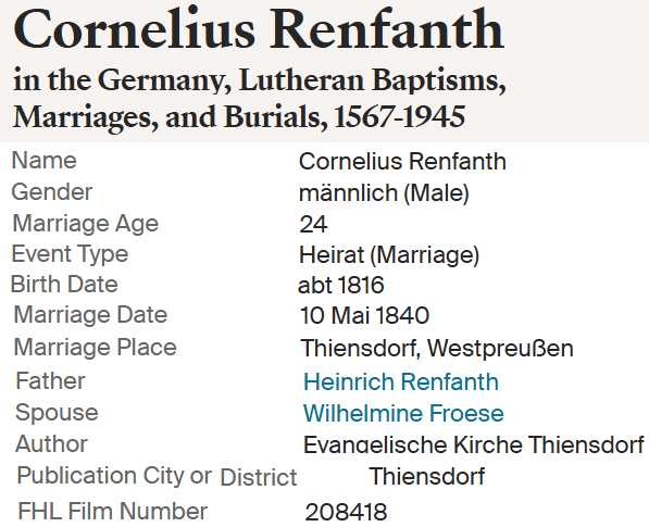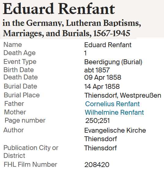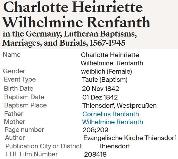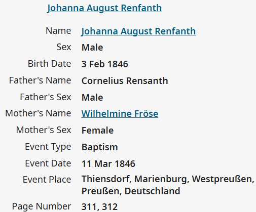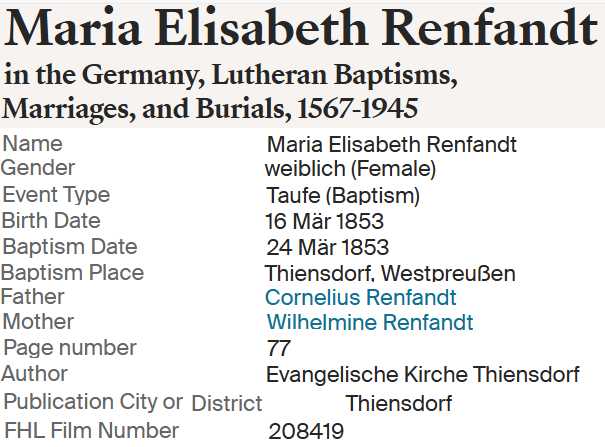 | Maria Elisabeth Renfandt | 16 Mar 1853 Evangelische Kirche Thiensdorf (Kr. Marienburg) |