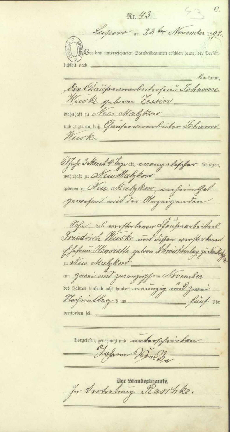 Johanne Louise Zessin Death, 1893, New Malzkow