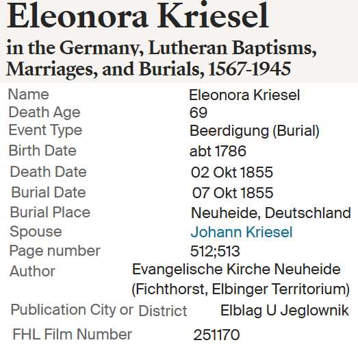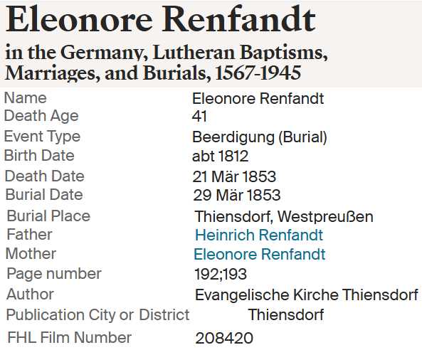 | C5 | Helena Eleanora Renfandt | 9 Mar 1812 | 21 Mar 1853 Evangelische Kirche Thiensdorf (Kr. Marienburg) |