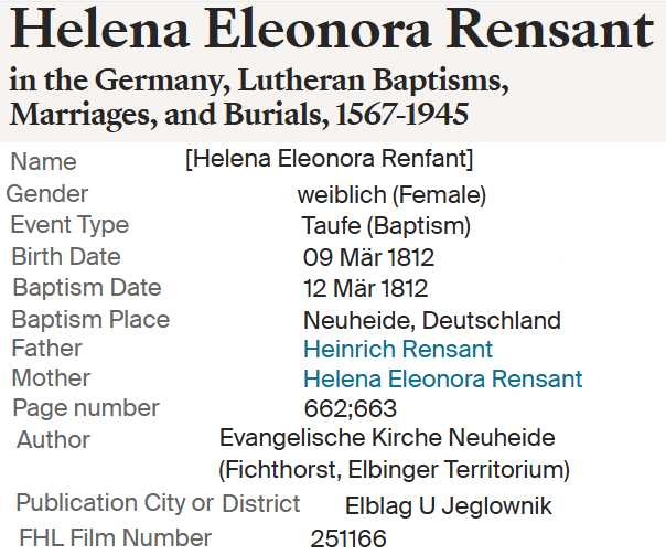 Birth Record - Helena Eleanore Renfant Thiensdorf and Neuheide Records