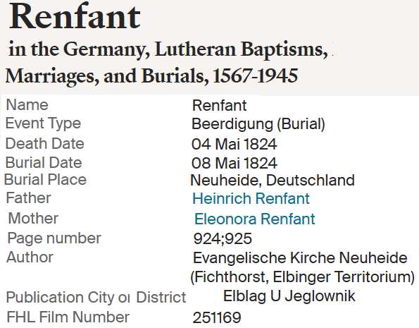 | C12 | Unnamed Renfandt | 1824 | 4 May 1824 Evangelische Kirche Neuheide (Fichthorst, Elbinger Territorium) |
