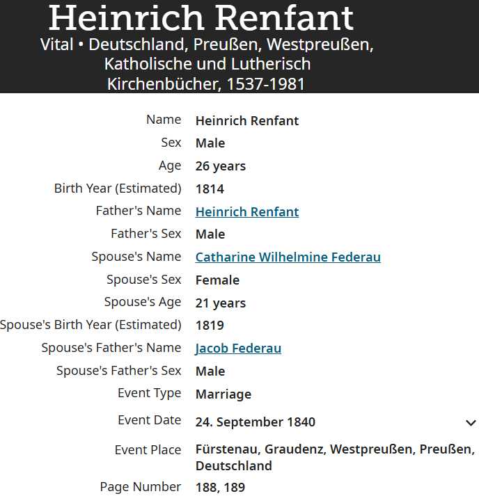 | 1 | Heinrich Adolph Renfandt | 28 Sep 1841 Evangelische Kirche Neuheide (Fichthorst, Elbinger Territorium) |