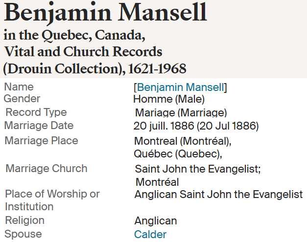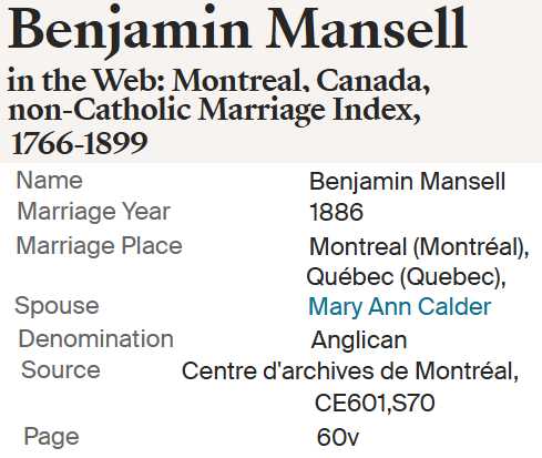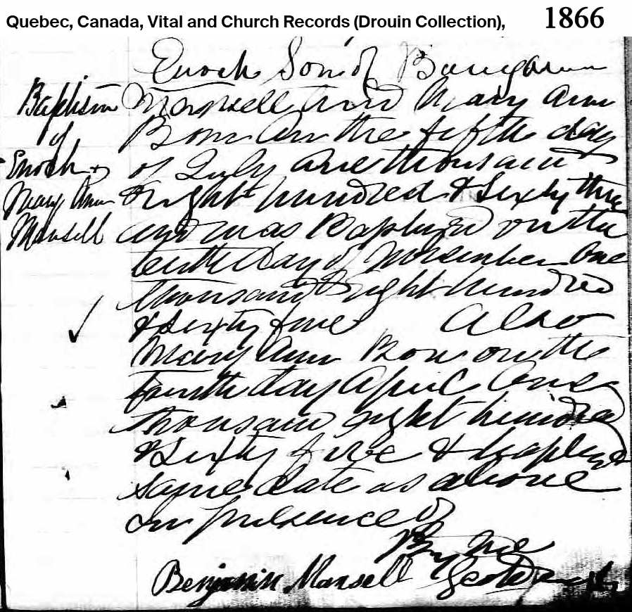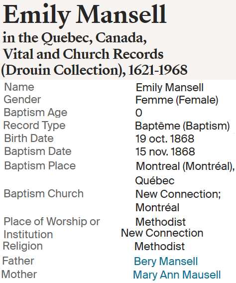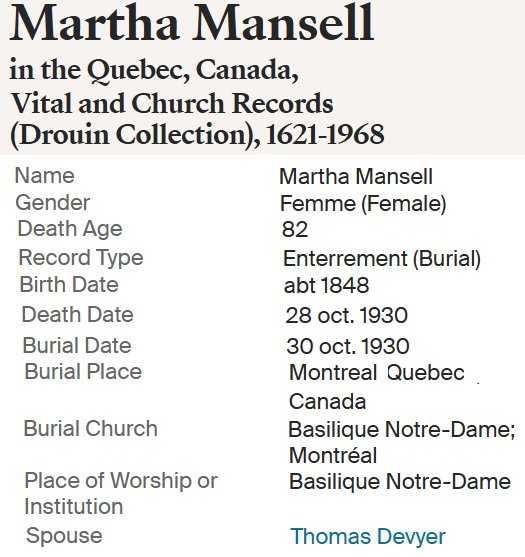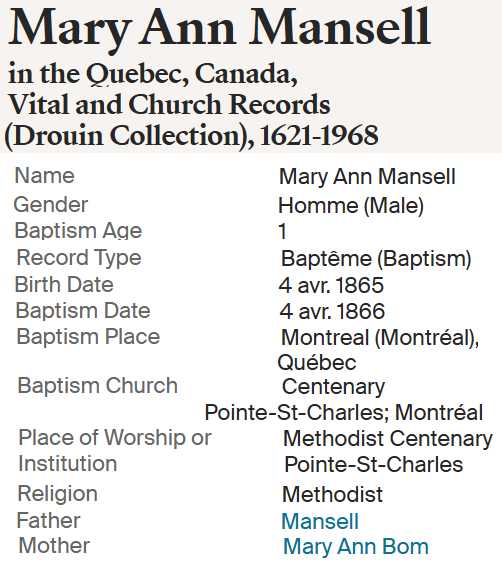 | 8 | Mary Ann Mansell | 5 Apr 1865 Montreal Region, Quebec, Canada |