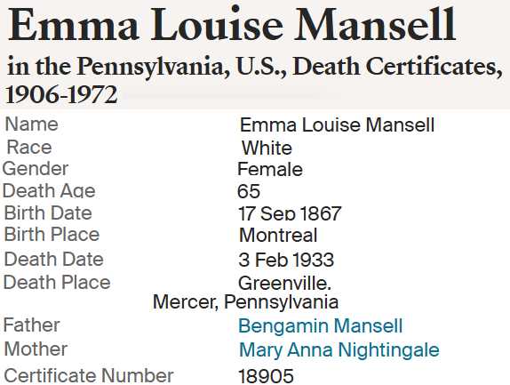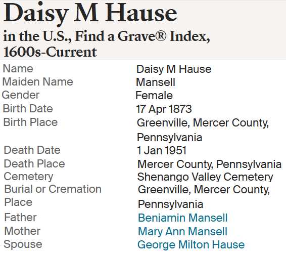 | 11 | Daisy Mansell | 17 Apr 1873 Greenville, Mercer County, Pennsylvania |
