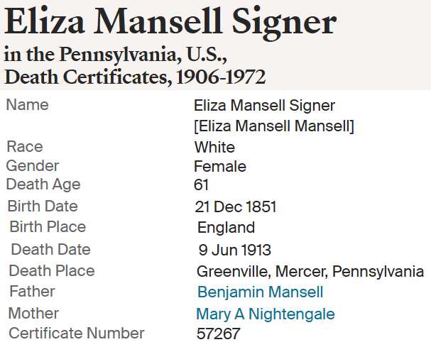 | 3 | Eliza Mansell | Abt. 1851 Kidsgrove, Staffordshire, England |