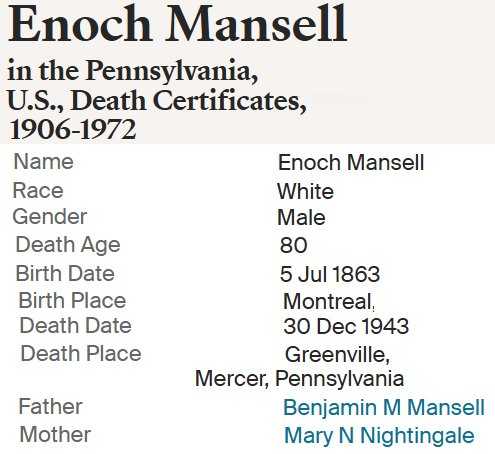 | 7 | Enoch Mansell | 5 Jul 1863 Montreal, Montreal Region, Quebec, Canada |