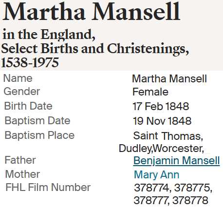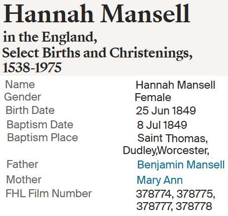| 2 | Hannah Mansell | 25 Jun 1849 Saint Thomas,Dudley, Worcester,England |