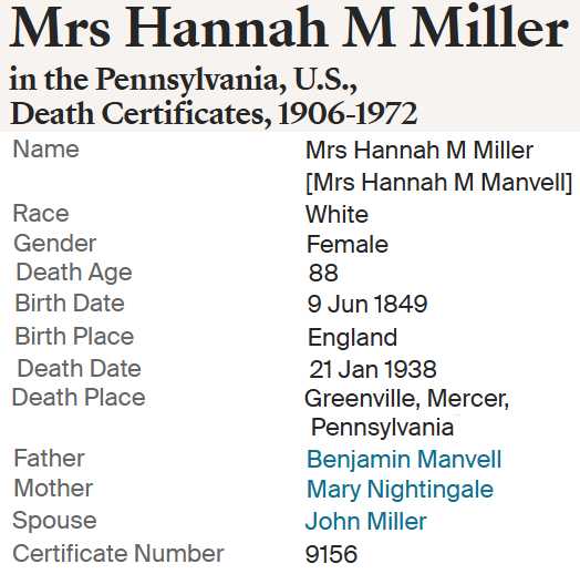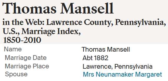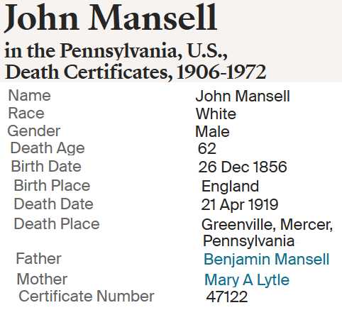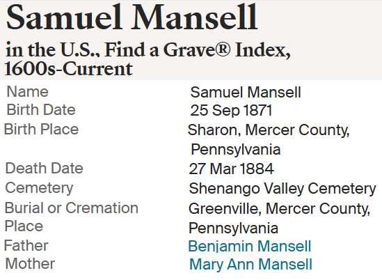 | 10 | Samuel Mansell | 25 Sep 1871 Greenville, Mercer County, Pennsylvania |