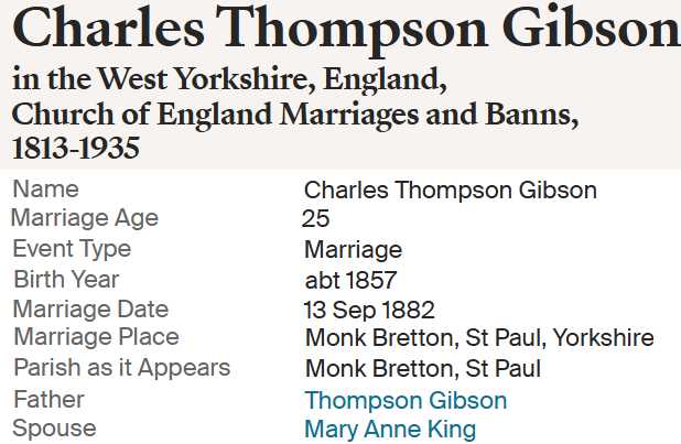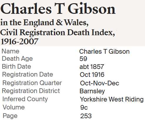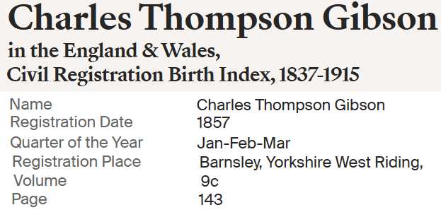 | Charles Thompson Gibson | 28 JAN 1857 Worsborough, Yorkshire, England |