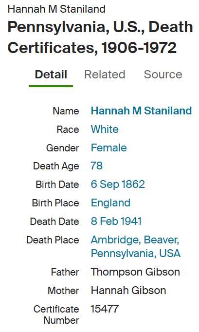 | Anna Maria Stanlaine (Hannah) | 49 | 28 | 1894 | England | 10/8 |