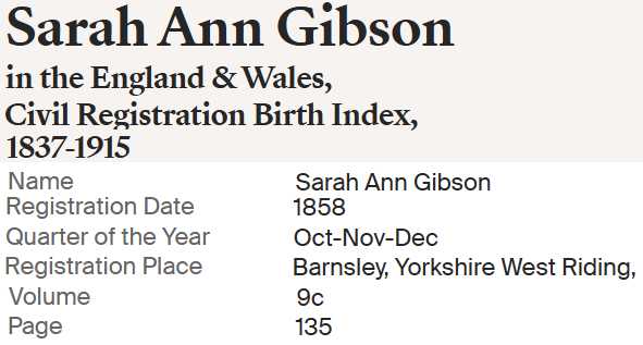 | Sarah Ann "Sally" Gibson | DEC 1858 Worsborough, Yorkshire, England |