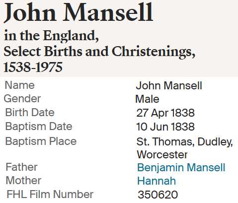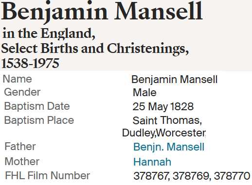 | 3 | Samuel Mansell | 29 FEB 1824 Saint Thomas, Dudley, Worcester, England |