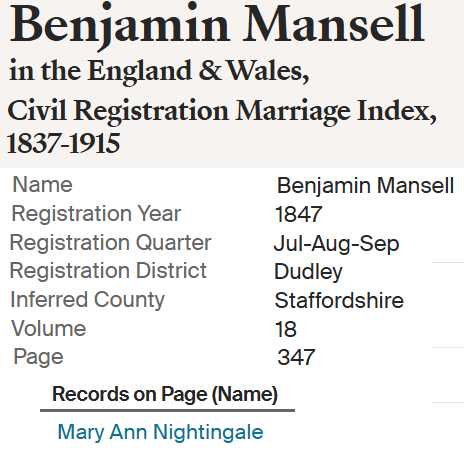 Mary A. Nightengale 18 Jul 1847 St Thomas, Dudley, Worcester, England |