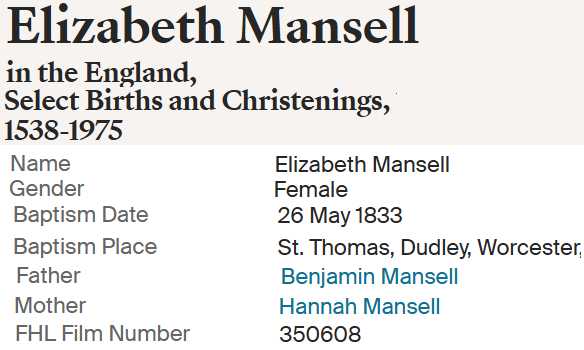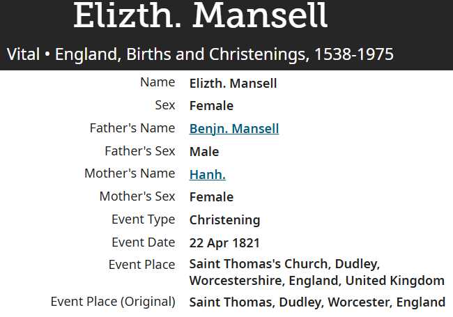 | 1 | Elizabeth Mansell | 22 APR 1821 Saint Thomas, Dudley, Worcester, England |