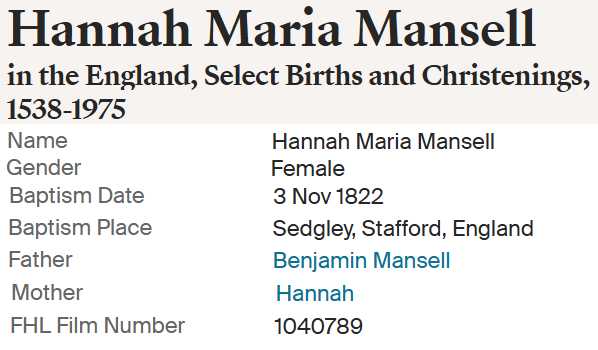 | 2 | Hannah Maria Mansell | 03 Nov 1822 Sedgley, Stafford, England |