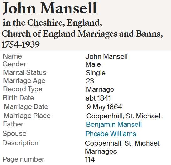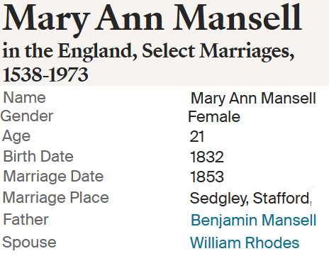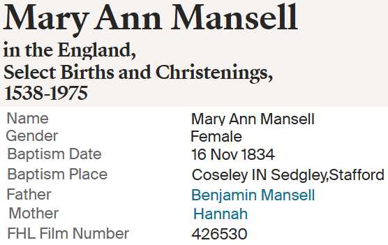 | 8 | Mary Ann Mansell | 16 NOV 1834 Coseley In Sedgley, Stafford, England |