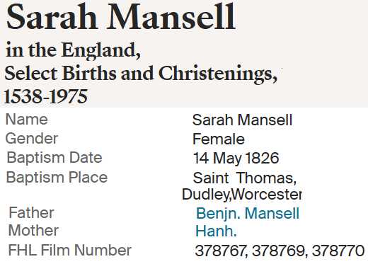 | 4 | Sarah Mansell | 14 MAY 1826 Saint Thomas, Dudley, Worcester, England |