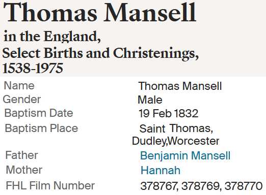 | 6 | Thomas Mansell | 19 FEB 1832 Saint Thomas, Dudley, Worcester, England |