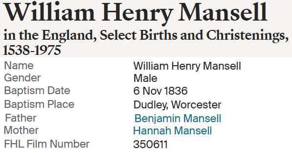 | 9 | William Henry Mansell | 06 NOV 1836 Saint Thomas, Dudley, Worcester, England |