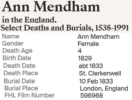 | Ann Mendham | 9 Sep 1829 Bap 10 Jan 1830 |