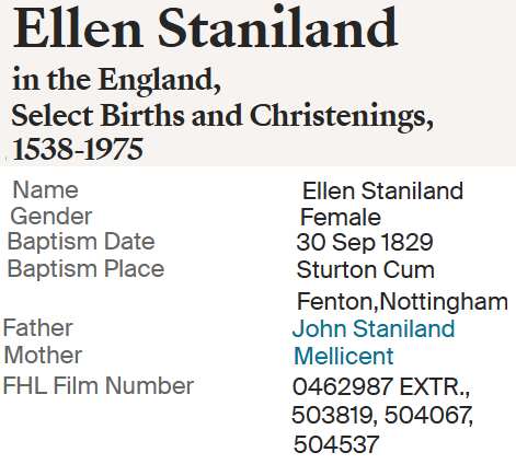 | 2 | Ellen Staniland | 30 SEP 1829 Sturton Cum Fenton, Nottingham, England |