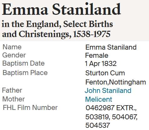 | 3 | Emma Staniland | 6 Feb 1832 Bap 01 APR 1832 Sturton Cum Fenton, Nottingham, England |
