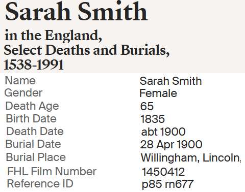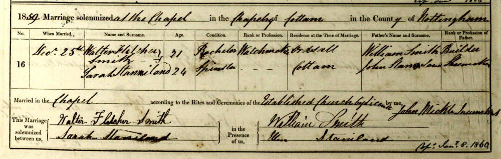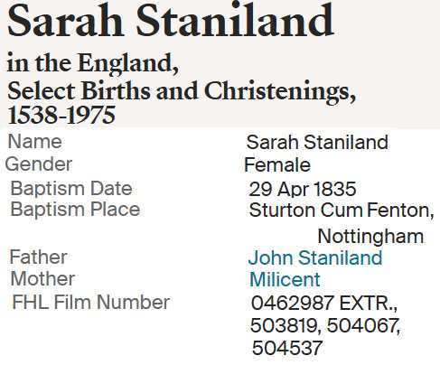 | 4 | Sarah Staniland | Bap 29 APR 1835 Sturton Cum Fenton, Nottingham, England |