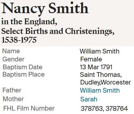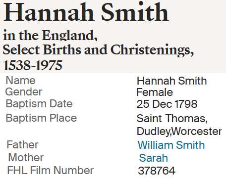 | 3 | Hannah Mary Smith | 25 Dec 1798 Saint Thomas, Dudley, Worcester, England |