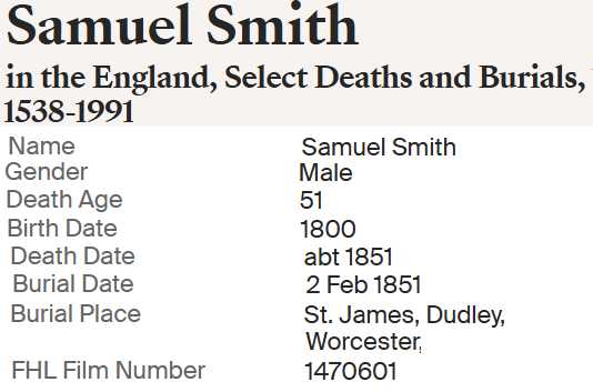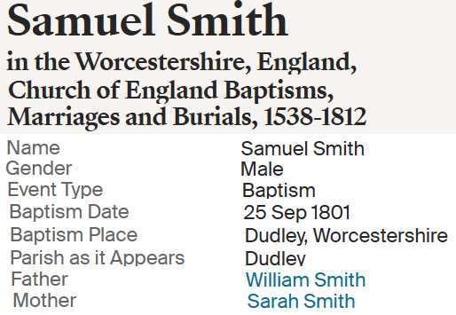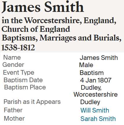| 5 | James Smith | 04 JAN 1807 Saint Thomas, Dudley, Worcester, England |