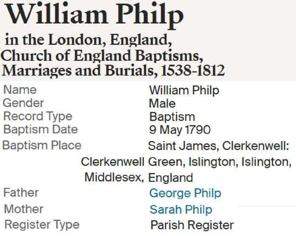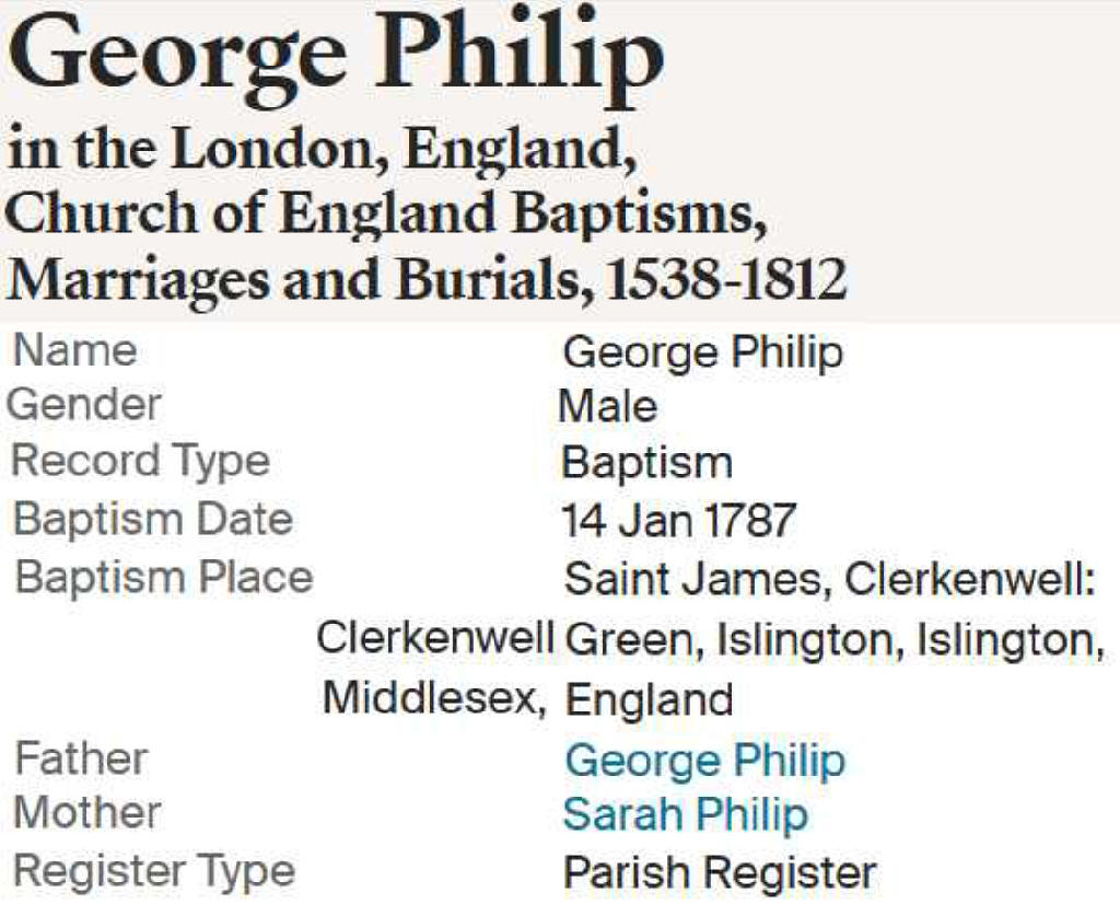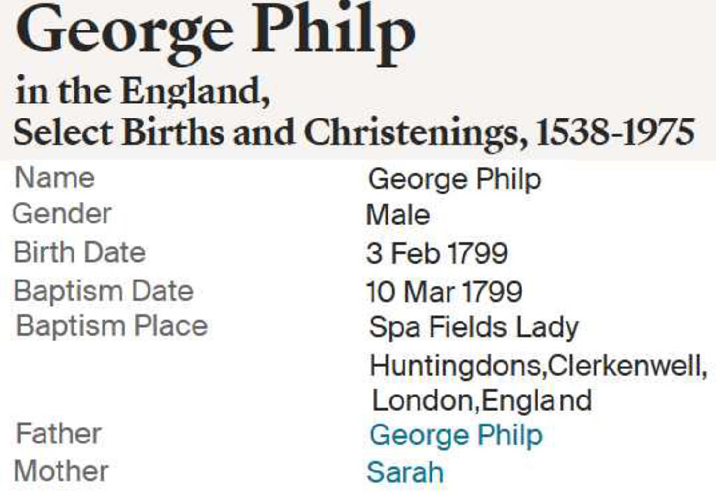 | George Philp | 03 FEB 1799 (Ch) 10 MAR 1799 Spa Fields Lady Huntingdons, Clerkenwell, London, England |