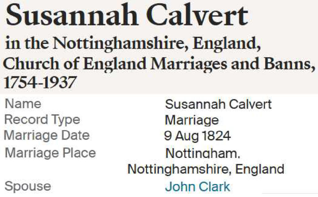 | Susannah Calvert | 1804 | John Clark ?? 1824 | ||
